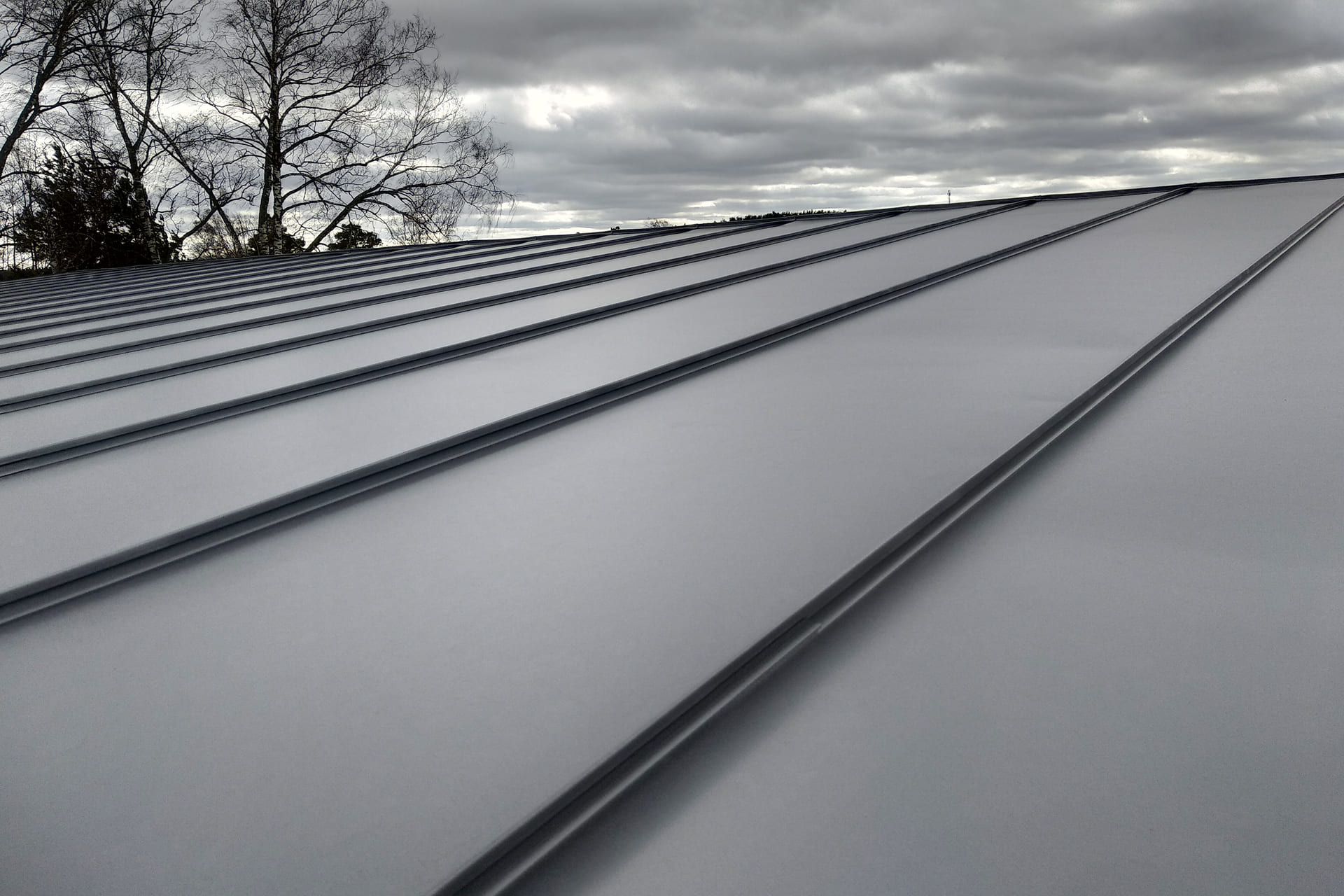 Vertical metal panels run from the ridge down to the eave, with raised interlocking seams connecting them — no exposed screws, no rubber grommets, and no penetrations through the surface of the metal itself. What you get is a clean, continuous roofing surface with no weak points for water or ice to find.